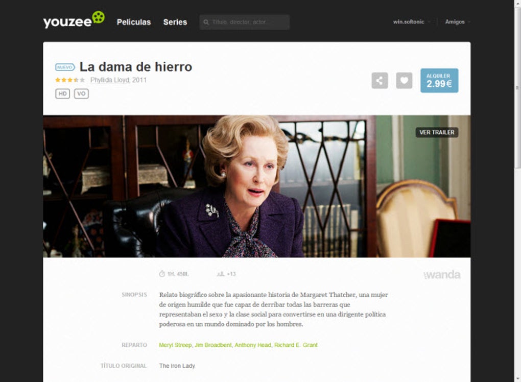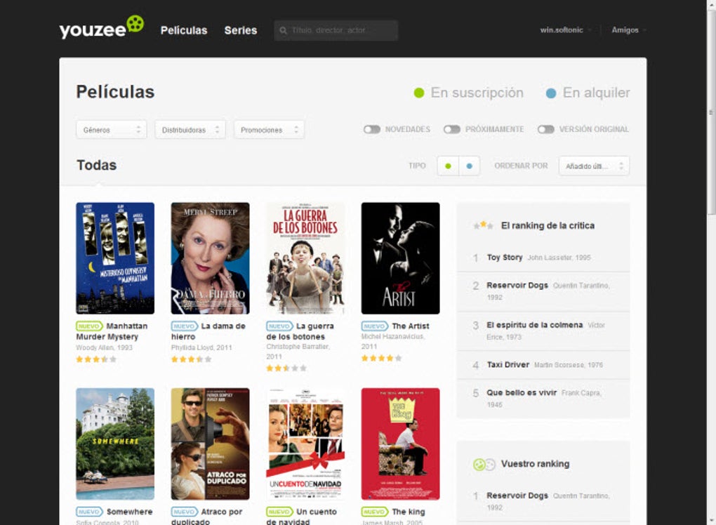 Además, Youzee incluye los últimos éxitos de videoclub en calidades estándar y alta definición, incluso en versión original con subtítulos. Su alquiler se paga por separado, y por lo general su precio es más bajo que en otras alternativas.