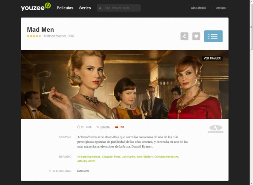 Con Youzee puedes ver y disfrutar de una gran colección de filmes de todas las épocas y géneros, series de televisión modernas y de siempre, dibujos y más. Aunque algunos son gratis, la mayoría están disponibles si te suscribes por algo menos de 7 euros al mes, de forma ilimitada y sin publicidad.